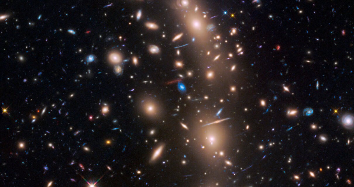 Esta imagem do enorme aglomerado de galáxias MACS J0416.1-2403 fazia parte do projeto Frontier Fields do Telescópio Espacial Hubble, que combinava o poder das “lentes gravitacionais” naturais no espaço com a capacidade do Hubble de criar imagens de campo profundo de longa exposição. Lentes gravitacionais ocorrem quando a imensa gravidade de aglomerados massivos de galáxias amplifica e distorce a luz dos objetos atrás deles. Isso torna possível ver objetos muito além do alcance dos telescópios normais. Neste caso, observações conjuntas desse aglomerado feitas por Hubble e pelo Telescópio Espacial Spitzer revelaram uma galáxia extremamente distante que teria existido cerca de 400 milhões de anos após o Big Bang. Astrônomos apelidaram a galáxia de Tayna, que significa “primogênito” em aymara, uma língua falada nas regiões dos Andes e do Altiplano da América do Sul. Tayna representa uma classe menor e mais fraca de galáxias recém-formadas que antes haviam escapado da detecção e que eram consideradas mais representativas do universo primitivo, oferecendo novas percepções sobre a formação e evolução das primeiras galáxias. MACS J0416.1-2403 está localizada na constelação de Eridano. Para uma imagem de Tayna e informações adicionais, visite: hubblesite.org/contents/news-releases/2015/news-2015-45.html
